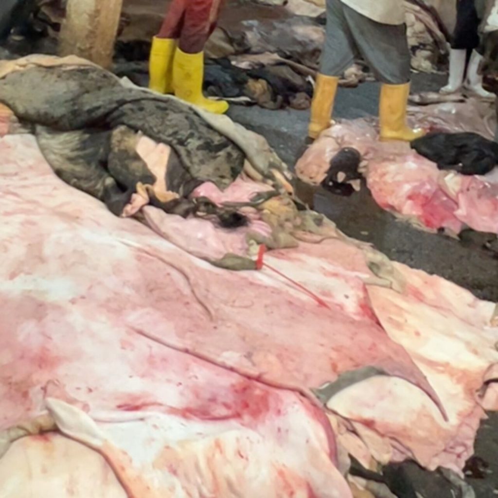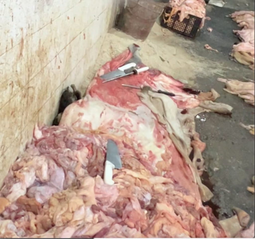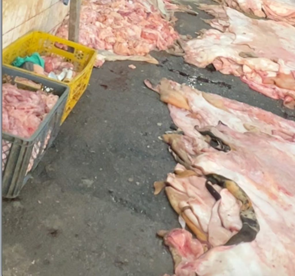 Sin embargo, las condiciones en las que se comercializa este producto son alarmantes. La carne no se refrigera, se almacena en canastas tiradas en el suelo, es manipulada sin guantes y pisada constantemente por trabajadores de las curtiembres. Cualquier comprador puede tocarla para verificar su textura. Las paredes, visiblemente manchadas, evidencian la falta de aseo y de controles sanitarios.