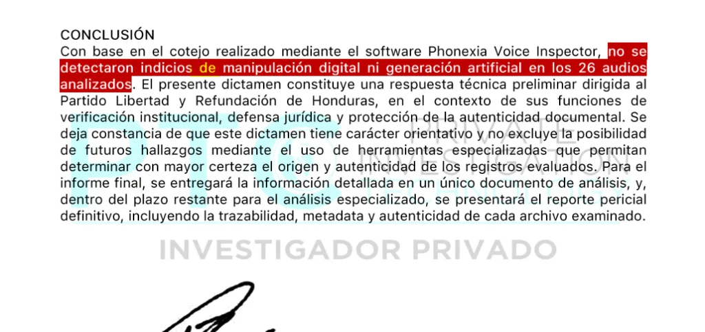 La verificación técnica fue encargada a la firma forense PTC Private Investigation Technology, con sede en Bogotá, Colombia. Según el documento, los análisis no hallaron indicios de manipulación digital ni de generación artificial en las grabaciones, lo que desmiente versiones que intentaban desacreditar el material difundido.
