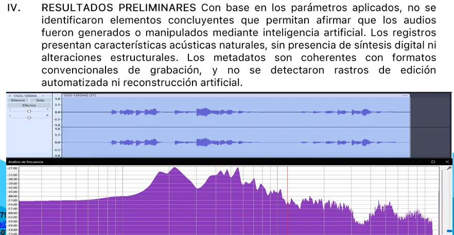El informe detalla que los audios fueron sometidos a cotejos de integridad, análisis espectrales, verificación de metadatos y filtros de detección de edición digital, clonación vocal y síntesis automatizada. Los resultados confirman coherencia temporal y acústica propias de grabaciones naturales y no reconstruidas.
